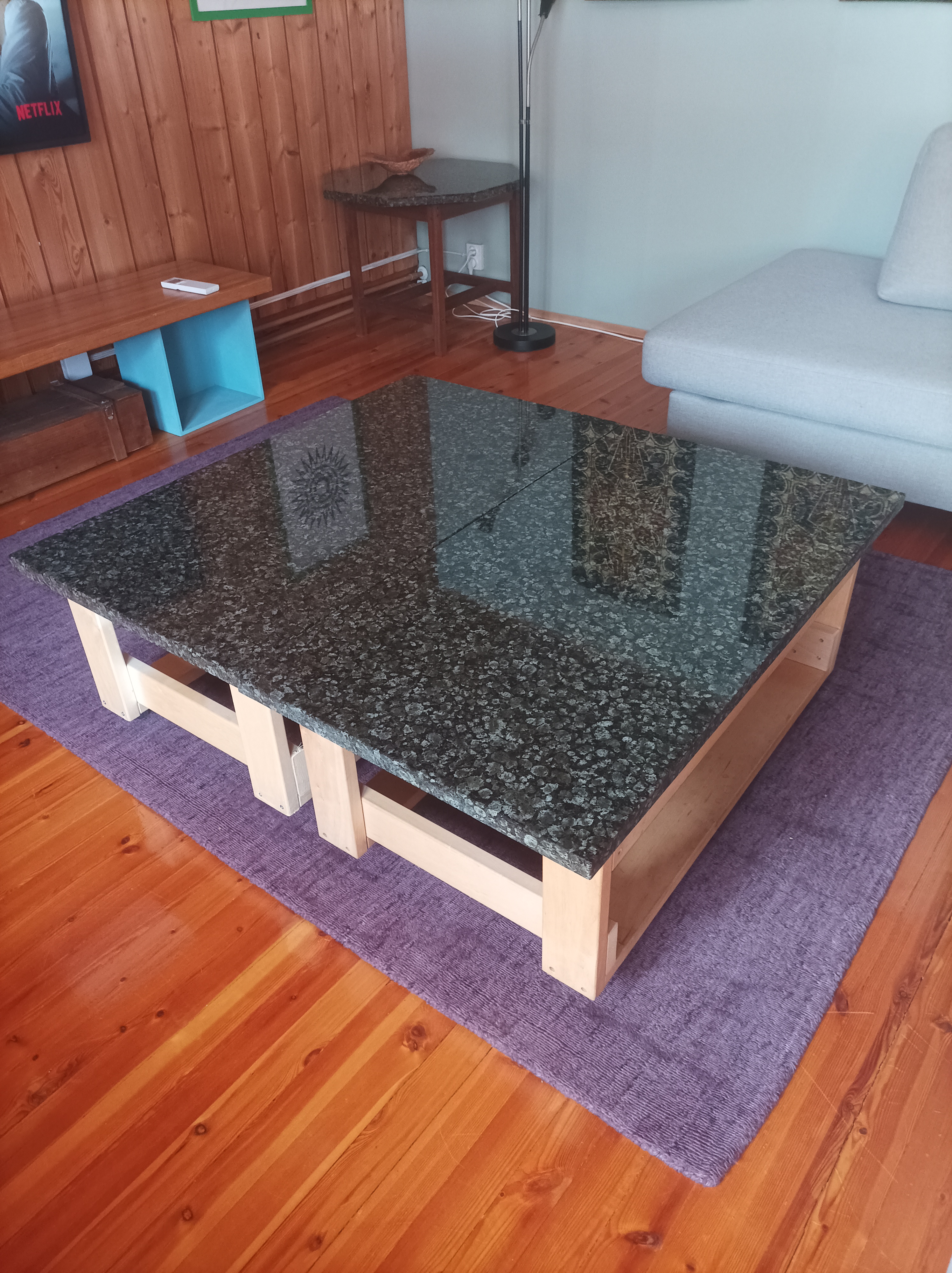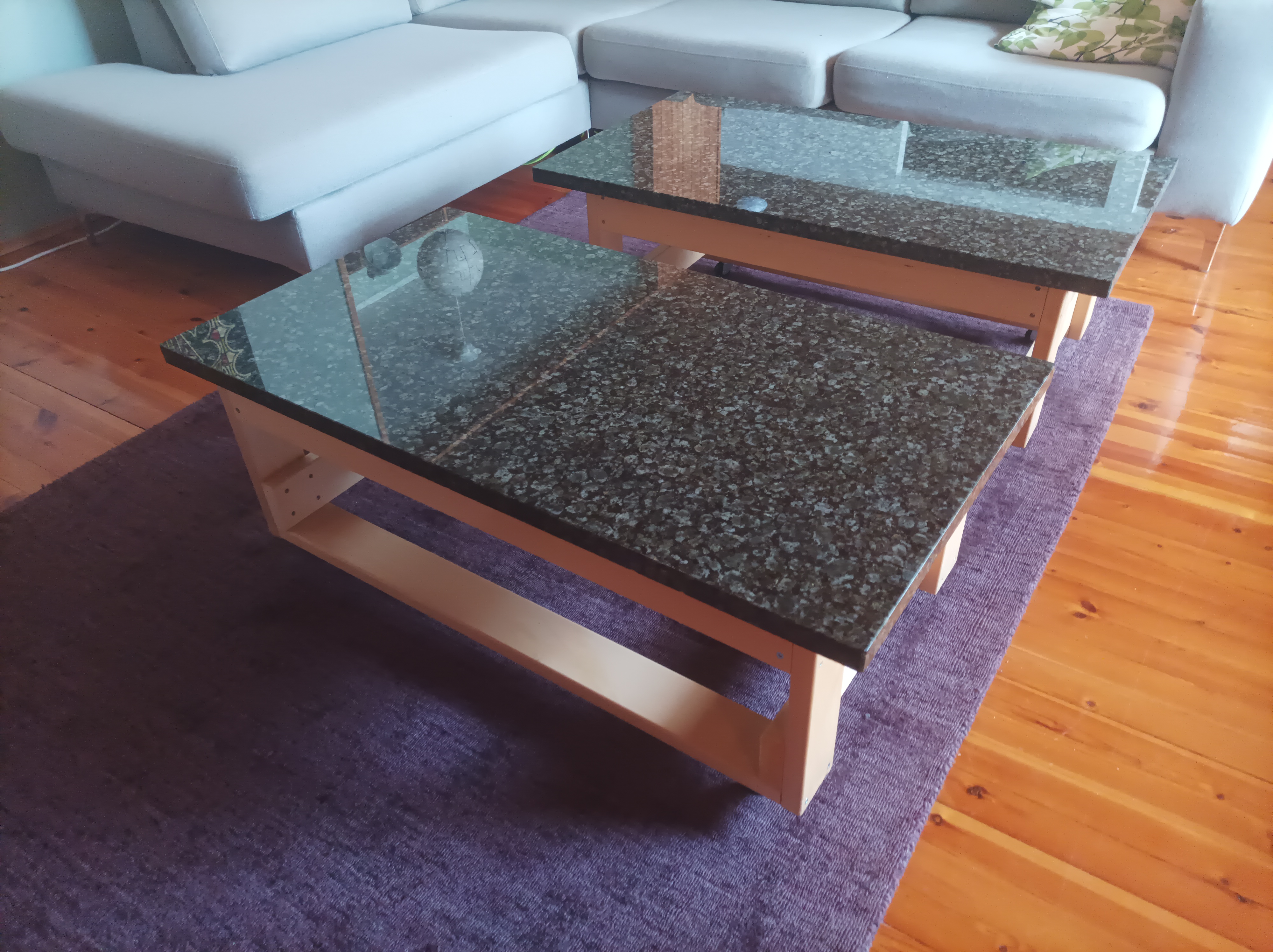 A friend had been studying at a local technical college doing landscaping and stonework, but the college was closing down the stonework course. So they needed to get rid of all the 'practice' stone they had lying around in their stores. I managed to get a 4 m2 piece of this granite (3cm thick), at an exteremely good price. Obviously this was way to big and heavy to be moved or used as it. So my friend cut it down to more manageable sizes for me, and finished the edges. All I then needed to do was build a basic frame for each table.