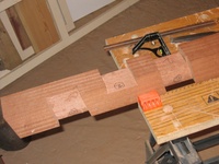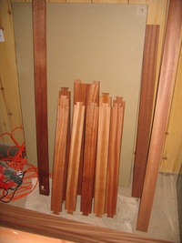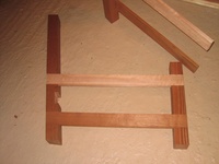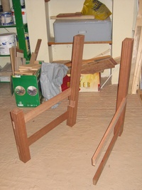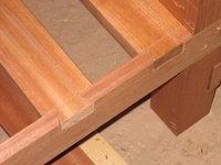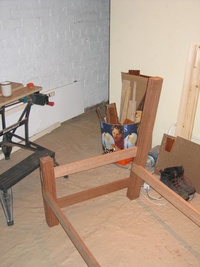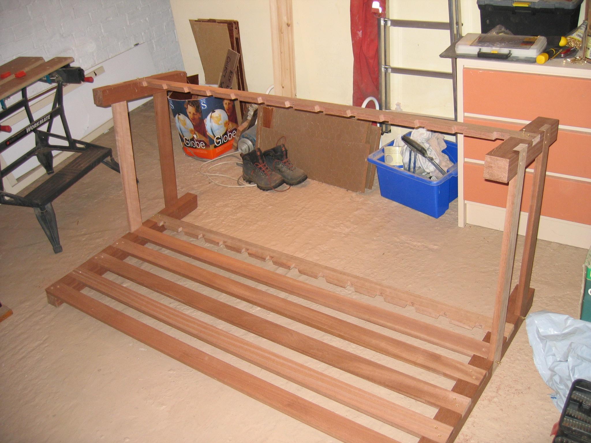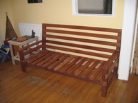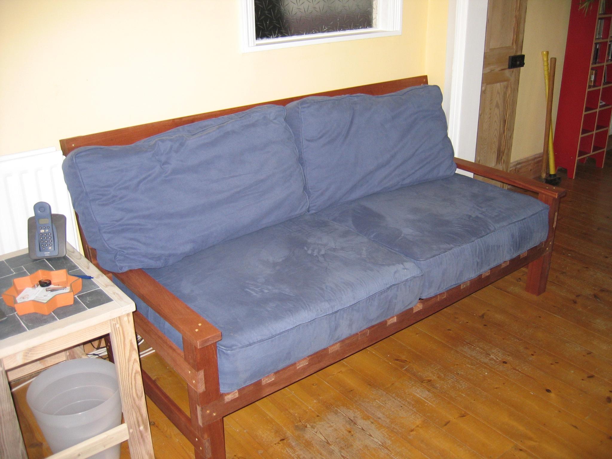 The frame is made from sapele, and the base is flat, so it can be used as a bed too (it's long enough for me at least). At the time I built it, I didn't think much about what I'd do about the cushions. Then, by chance, a friend was getting rid of an old sofa (the frame had broken), which had cushions I could reuse, and, again by complete chance were pretty much exactly the right size!